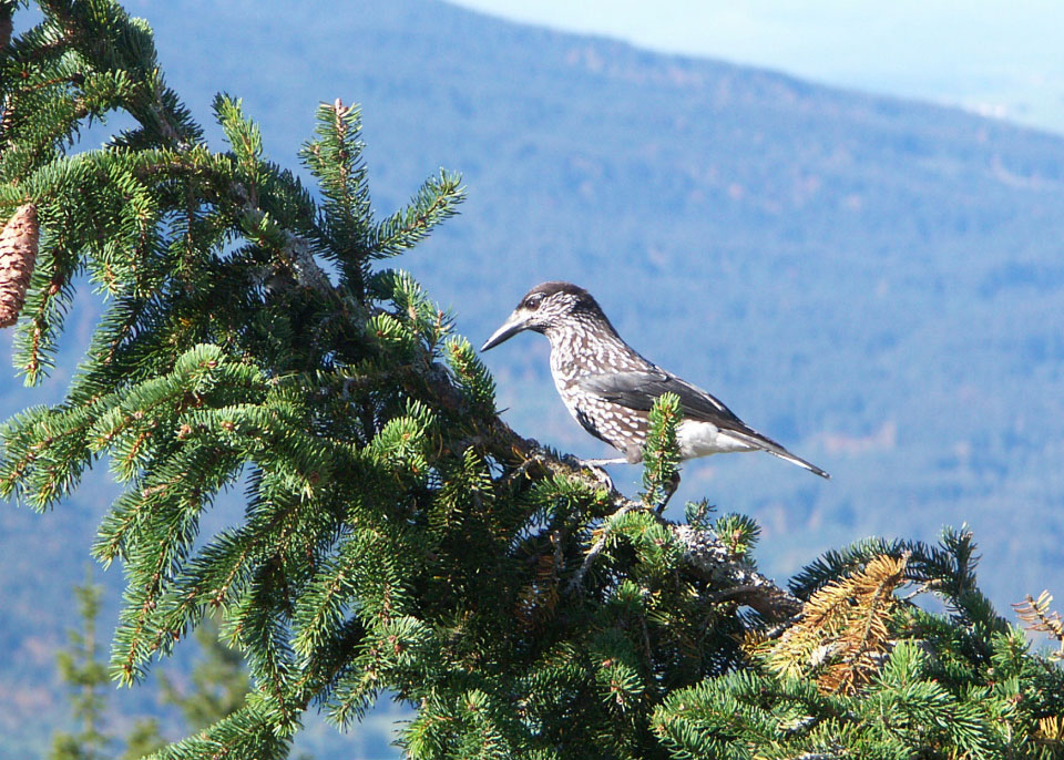Hallo, ich bin Anton der Tannenhäher. Meine Heimat ist das Hörnle, der Hausberg von Bad Kohlgrub. Ich liebe die Nadelwälder und esse am liebsten Arvennüsschen.